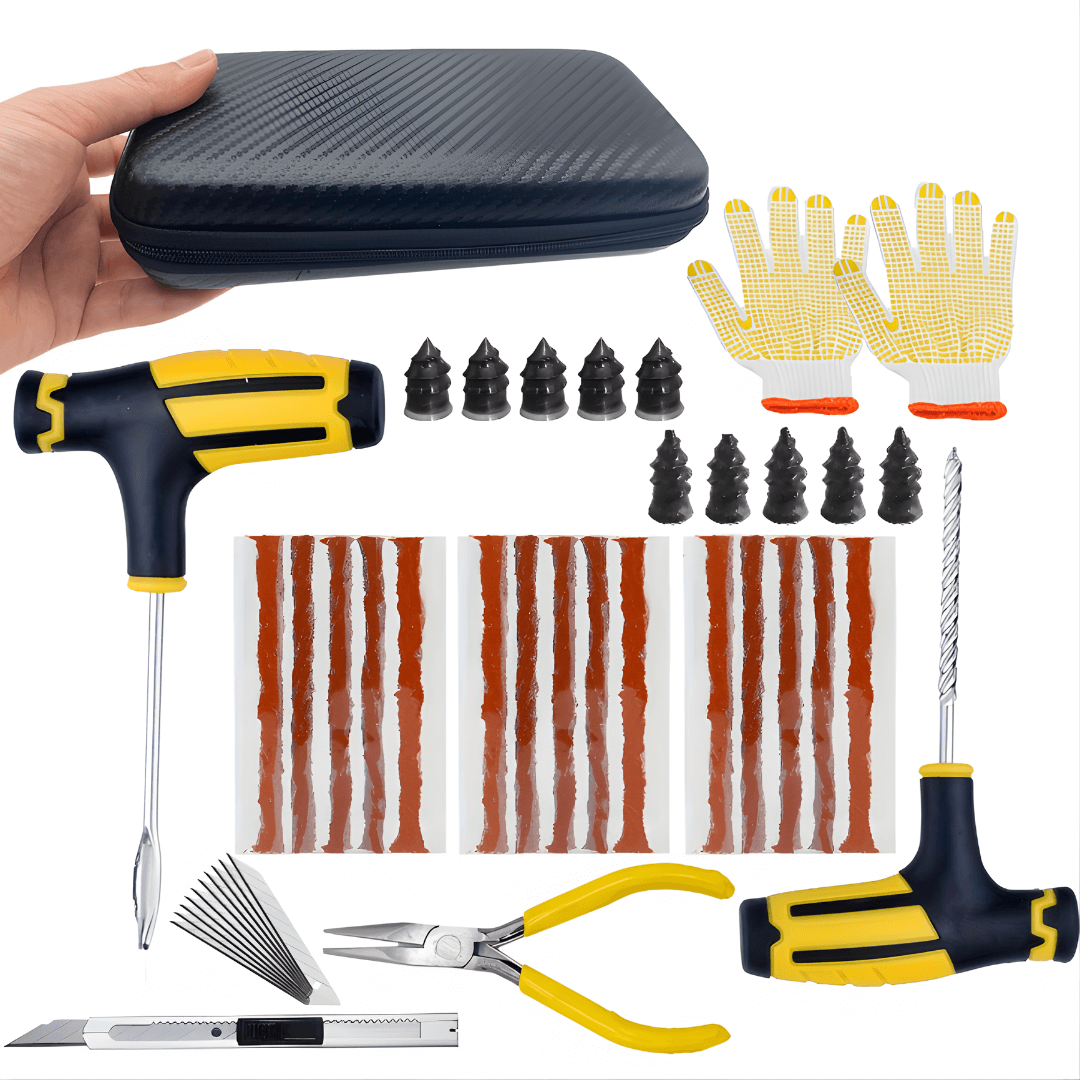 Includes T-handle tools, repair plugs, valve stems, pressure gauge & more.